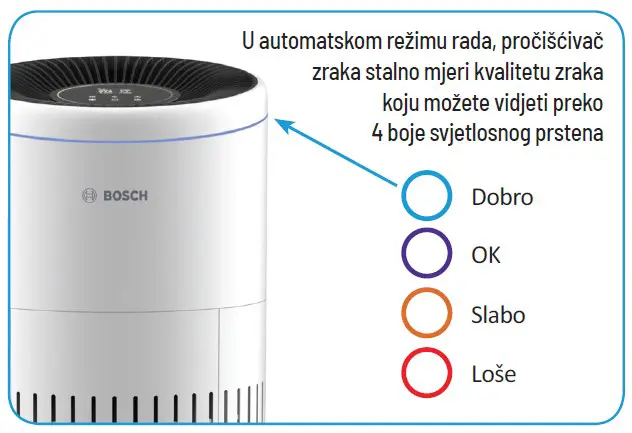 Višestupanjski sustav filtara uklanja 99,9 % svih štetnih tvari Bosch pročišćivači zraka mogu filtrirati 99,9 % svih štetnih tvari iz zraka. Predfiltar osigurava uklanjanje prašine iz zraka, a filtar HEPA13 filtrira alergene koji se prenose zrakom, kao i bakterije, viruse i jako male čestice. Dodatno ugrađeni filtar s aktivnim ugljenom pouzdano filtrira neugodne mirise u kući koji, primjerice, nastaju tijekom kuhanja. Pritom korisnik može vidjeti trenutačnu kvalitetu zraka u stvarnom vremenu s pomoću LED svjetlosnog prstena s kodom boje. Označivanjem bojama vizualizira se kvaliteta zraka u prostoriji, i to u četiri različite boje, od plave (dobro) do crvene (loše).