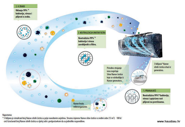 Spektar prednosti nanoeTM elektrostatičkih ionizirajućih čestica vode je širok, od neutralizacije virusa i bakterija, uklanjanja plijesni alergena do ovlaživanja kože. Testiranja provedena na sveučilištima i istraživačkim laboratorijima dokazala su utjecaj nanoeTM na kakvoću zraka u prostoru. Uporabom nanoe tehnologije čestica, štetni organizmi uklanjaju se iz zraka koji udišete. No što s onima koji se nalaze na namještaju i drugim površinama? Zadivljujuće je što je i te čestice moguće neutralizirati! Uz to, nakon što isključite klima uređaj, nanoeTM će neutralizirati i mikroorganizme na filtru tako da možete potpuno i mirno uživati u vašem životnom prostoru koji je svježiji i čišći. Oči cijelog svijeta usmjerene su u ovu tehnologiju budućnosti koja može postati ključ za pročišćavanje zraka.
