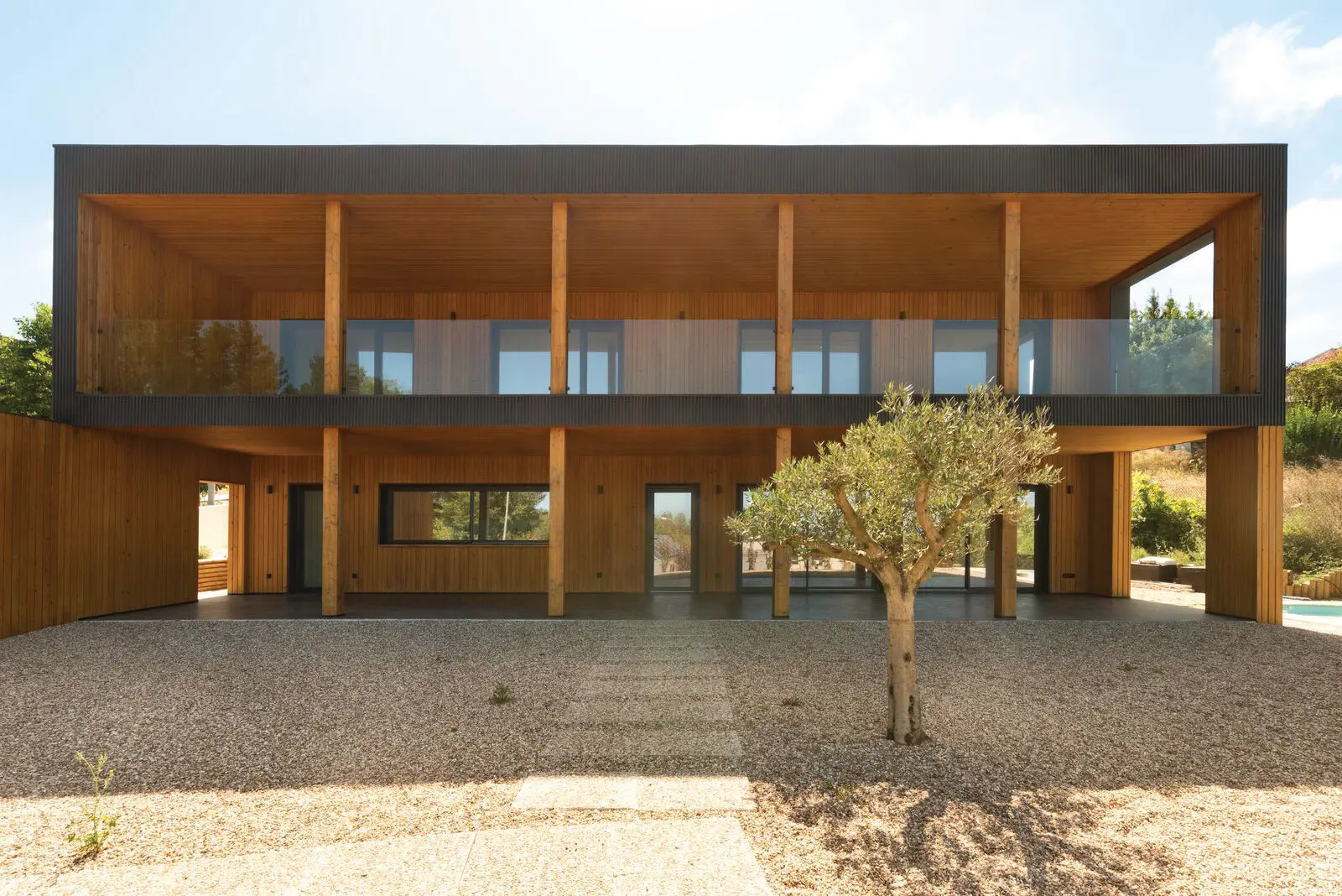 Fasada ove kuće sastoji se od pet slojeva koji učinkovito sprječavaju prodiranje vlage. Na donji dio kuće postavljena je asfaltna mreža do visine od 50 cm, iza koje se nalazi sloj od 50 mm ekspandiranog plutenog granulata, otpornog na truljenje. Slijedi vatrootporni i paropropusni hidroizolacijski sloj, ventilacijska zračna komora koja sprječava kondenzaciju, a na kraju dolazi završni premaz. Vanjski zidovi prizemlja obloženi su termički obrađenim drvenim panelima od nordijskog bora, dok je gornji kat prekriven pocinčanim limom s raspršenim plutom u antracit boji. Fasada terase obložena je također termički obrađenim nordijskim borom sa skrivenim nosačima.