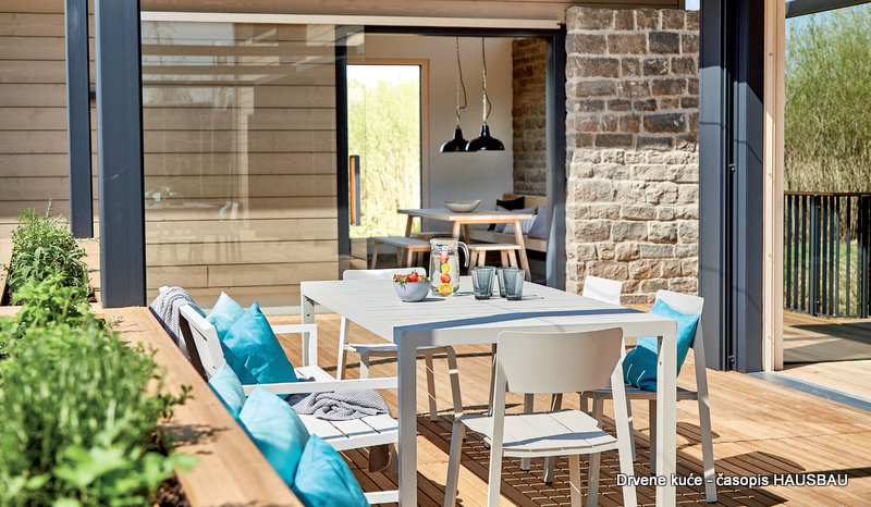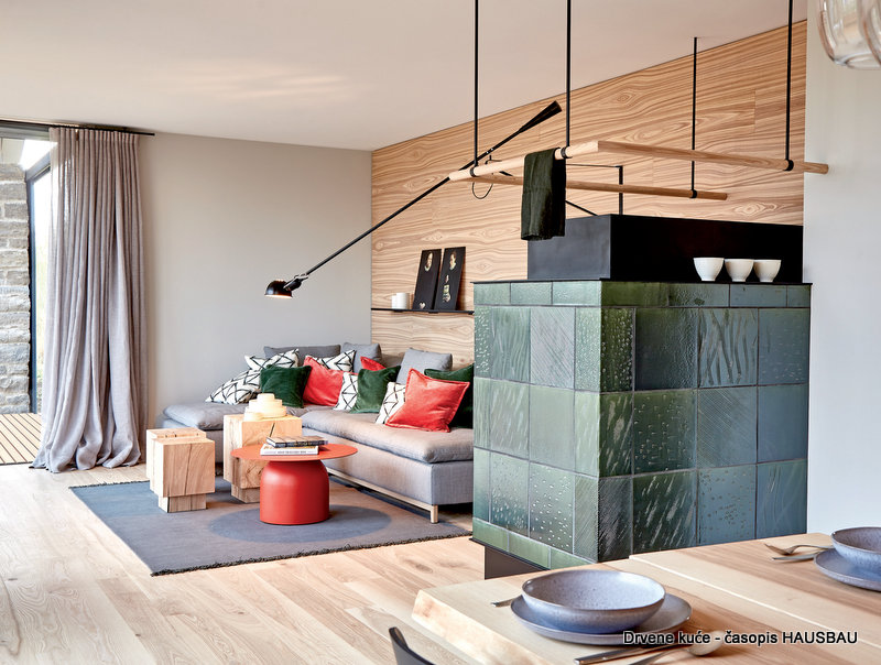 Obiteljska druženja odvijaju se u prizemlju, u otvorenom dnevnom boravku s integriranom blagovaonicom i kuhinjom, gdje se, kao nekada, svi mogu sastati. Tradicionalni elementi čine stambeni prostor udobnim – kao npr. alkoven (dio sobe u kojem je smješten krevet; obično odvojen balustradom i zastorom) koji je, u nešto drukčijem obliku, već u doba naših baka postojao u dnevnim boravcima. Daljnji nostalgični objekt za sjedenje je klupa ispred kuće koja je integrirana u fasadu. U ulaznom području u oči upadaju pločice u obliku saća s različitim uzorcima koje izgledaju kao da su od cementa, a koje bez prekida prelaze u visokokvalitetan