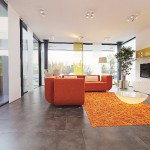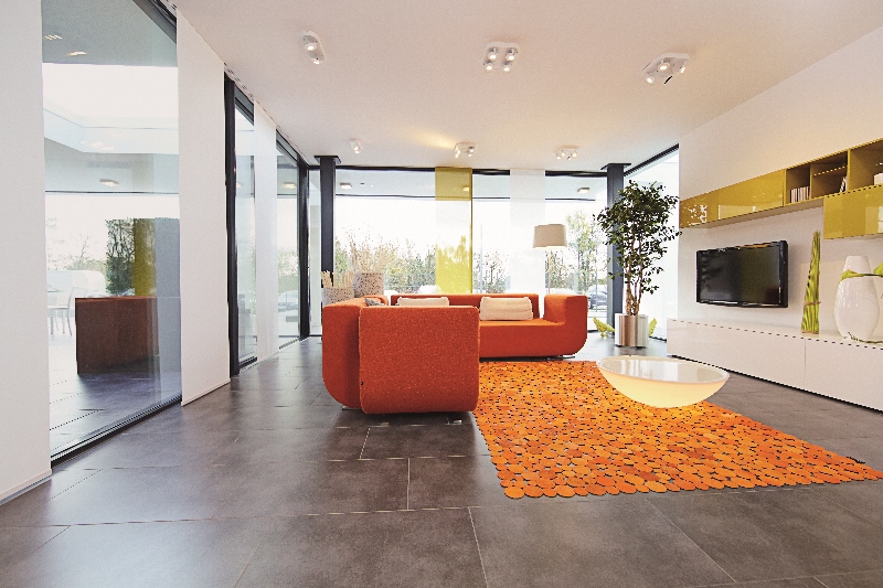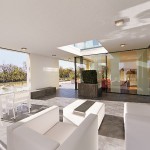 Staklene površine naizgled bez okvira u prostranom i otvoreno koncipiranom prizemlju propuštaju pregršt prirodnog svjetla čineći stanovanje ugodnim. Tako se stvara dojam transparentnosti i širine u prostoru koji ne djeluje neudobno ni hladno. Udobnost je dodatno naglašena znalačkom primjenom tonova u boji i spretnom upotrebom namještaja što kompenzira hladnoću podnog pokrova i stakla.