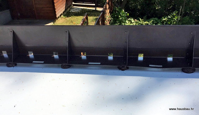 Novi slojevi su uključili parnu branu s uloškom od aluminija, gore navedene slojeve XPS-a, kao i jednoslojnu sintetičku (PVC) hidroizolaciju, koja je na svim krajevima završena zadignutim vertikalama, zavarenim na podkitanim lajsnama od kaširanog lima. Na ovako pripremljenu podlogu u susta- vu klasičnog krovnog sendviča, trebalo je osmisliti rubne i procjedne lajsne, od lima od kakvog je postojeći žlijeb i oluk. Standardnu šljunčanicu od pocinčanog lima, moguće je napraviti u željenoj visini i duljini, ali ju u ovom slučaju nije bilo moguće plastificirati, zbog duljine veće od 2 m. Osim toga, standardne su šljunčanice pripremljena za ugradnju na bitumenske membrane, a ne sintetičke. Uz malo razmišljanja na papiru, i jednostavni 3D nacrt za limara, napravljena je šljunčanica po mjeri, od gotovog plastificiranog pocinčanog lima, s detaljima prikladnim za pričvršćenje na PVC izolaciju bez bušenja kroz izolaciju.