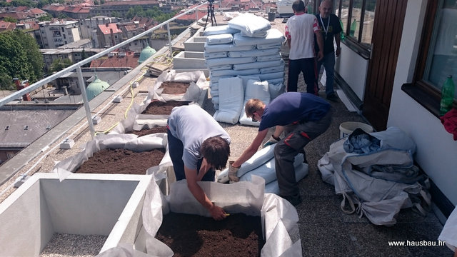 Kutije XPS Maestro obložene su građevinskim ljepilom i mrežicom te impregnirane nano premazom. Budući da su bez dna, sva 73 elementa povezana su u jedan sustav odvodnje, zajedno s procjednim plohama kulir ploča, položenim u šljunak, na drenažno-akumulacijskom kadicama iz Bauder sustava krovnih vrtova. Plodni supstrat, koji je gotovo upola lakši od zemlje, uz sustav navodnjavanja, omogućava stanarima da bez puno brige o bilju, uživaju u zelenilu na svom krovu. Jasno, bilje povremeno traži njegu, prihranu i pljevljenje, što su neki od stanara već zdušno prigrlili kao rekreaciju na dohvat ruke.