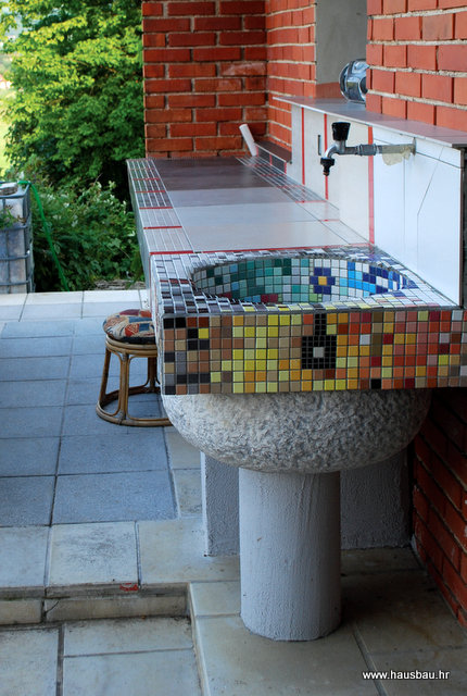 Bez obzira da li imate kuću s dvorištem ili veliku terasu, ljeti je ugodno kuhanje prebaciti u otvoreni prostor. Radna ploha mora biti čvrsta, jednostavna za čišćenje i održavanje. XPS kao materijal je ne samo tlačno opteretiv, nego ima i veliku nosivost. Ploča debljine 14 cm, teži svega 2,5 kg pod dužnom metru radne plohe širine 60 cm. Obradimo li ju građevinskim ljepilom i mrežicom, osim nosivosti dobiti će i površinsku čvrstoću. Na ovako obrađenu površinu možemo lijepiti keramičke pločice, ili staviti bilo koje druge materijale pogodne za vanjsku primjenu (plastične mase, limove, tanke kamene ili drvene ploče.