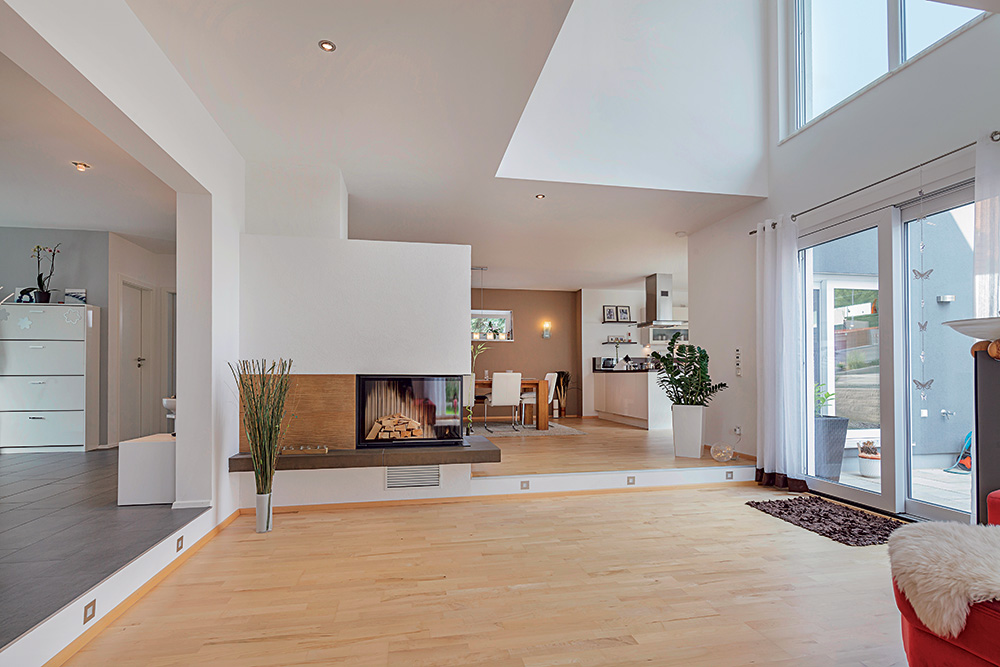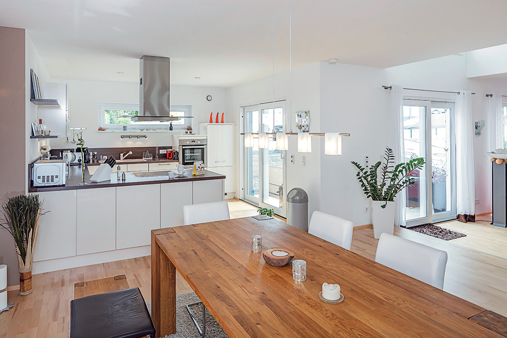 Kod ovog primjera prizemlje proširuje nadogradnja na kuhinju koja izvana osigurava mjesto zaštićenoj terasi dok je na katu neiskorištena, iako pruža dovoljno prostora za pristojnu krovnu terasu. Trenutno se na njenu površinu posipanu šljunkom gleda kroz tzv. francuski balkon. Galerija osigurava slobodan pogled prema prostranom stambenom dijelu između blagovaonice i dnevnog boravka, bez direktnog uplitanja u ono što se događa na sofi ili za stolom. Kuhinja u nadogradnji iz ove perspektive nije vidljiva. Galerija na katu razdvaja dječje sobe od roditeljskog trakta sa spavaonicom, garderobom i kupaonicom pored velike saune.
