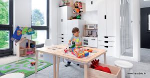 Inače, prizemlje je jako otvoreno, a zahvaljujući višestrukim prolazima veliko se predsoblje s klupom u obliku škrinje za blago stapa s kuhinjom i dnevnim boravkom tako da tu nastaje velika arena za veseo obiteljski život.