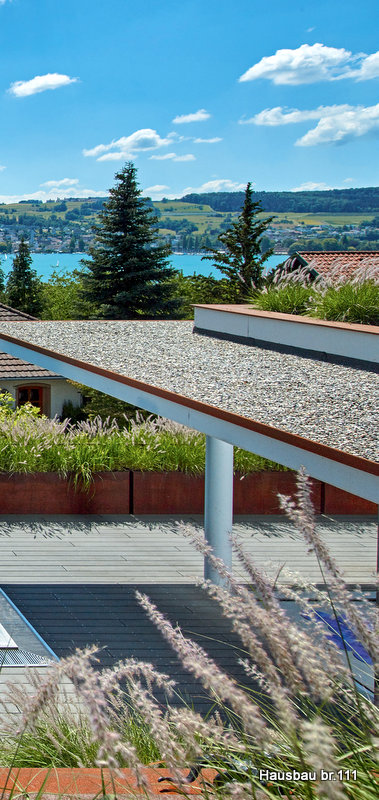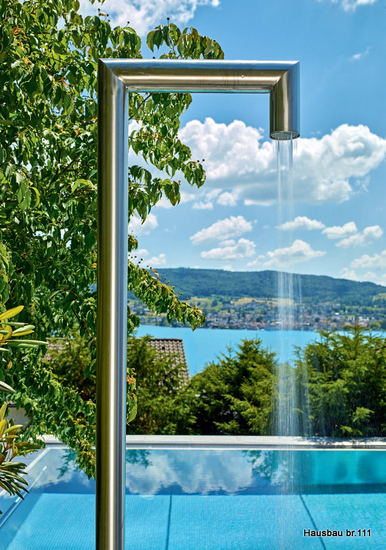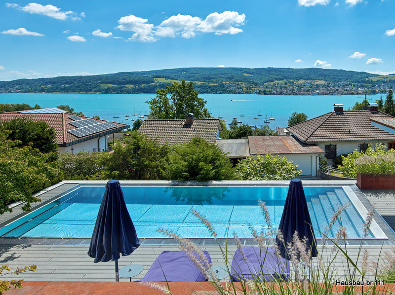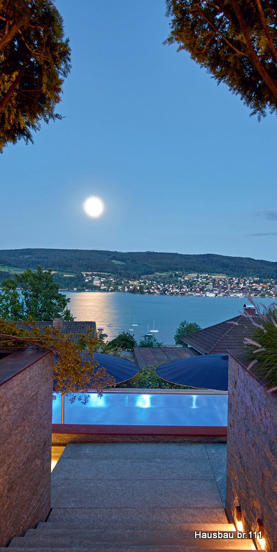 Investitori su na svom terasastom zemljištu željeli mjesto na kojem će opuštati dušu, s nesmetanim pogledom na prekrasnu kulisu na jezeru. Plan je bio infinity- bazen čiji preljevni rub na južnoj strani pruža pogled u daljinu. Koncept su razvili u suradnji s angažiranim graditeljom bazena Andreasom Sorgom. Atraktivni bazen od nehrđajućeg čelika, jednostavan za čišćenje i održavanje odgovarao je idejama vlasnika. Izgradnja ovakvog bazena nešto je zahtjevnija budući da je ispod infinity ruba potrebna posuda koja će skupljati vodu koja teče niz vanjski rub. Zahvat koji se doduše isplati, dok veličanstveni optički dojam opravdava sve napore.
