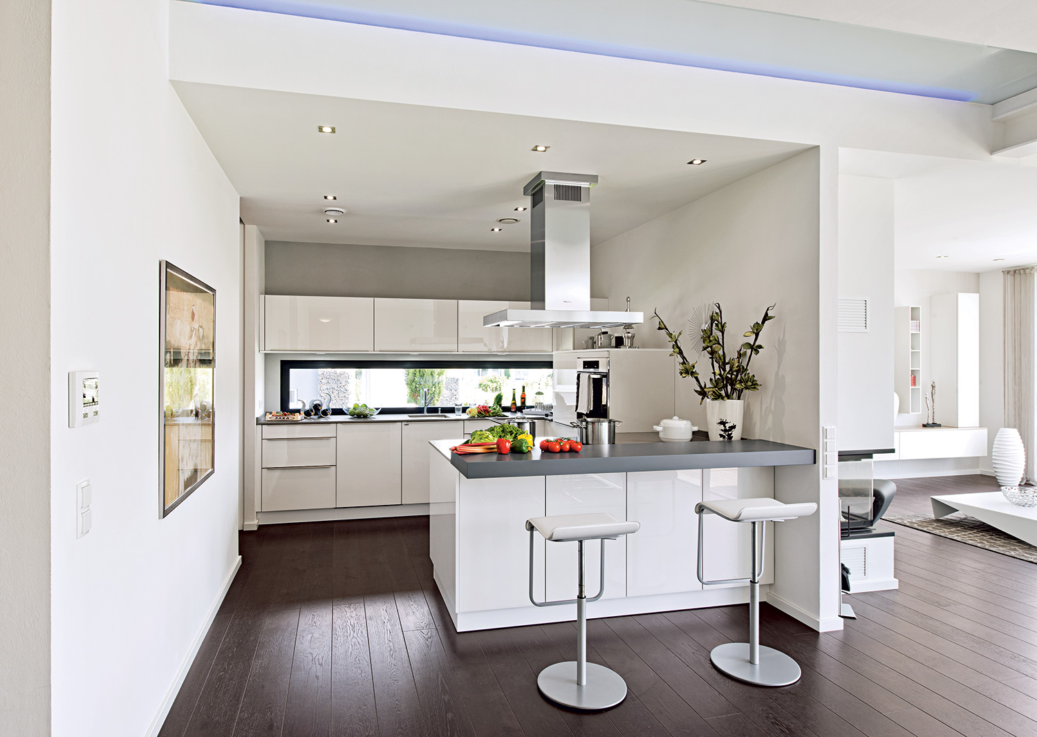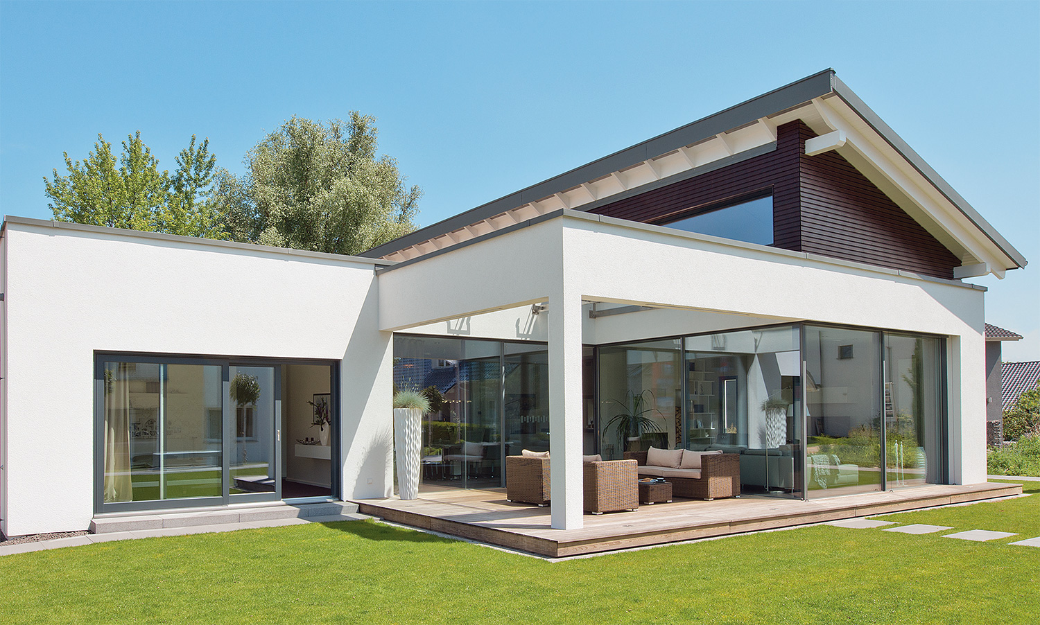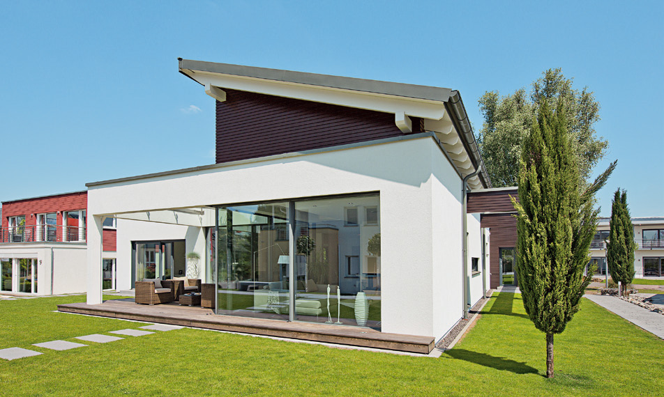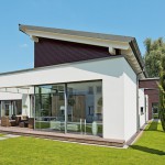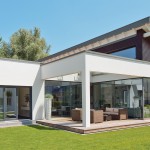 Blještava bijela fasada ukrašena prozorskim okvirima antracitne boje i djelomično pokrivena tamnim drvetom na izdignutom dijelu jednostrešnog krova, ovu prizemnicu čini veličanstvenom zahvaljujući jasnom i bezvremenskom dizajnu. Posebno je uočljiva kombinacija ravnog i kosog jednostrešnog krova.
