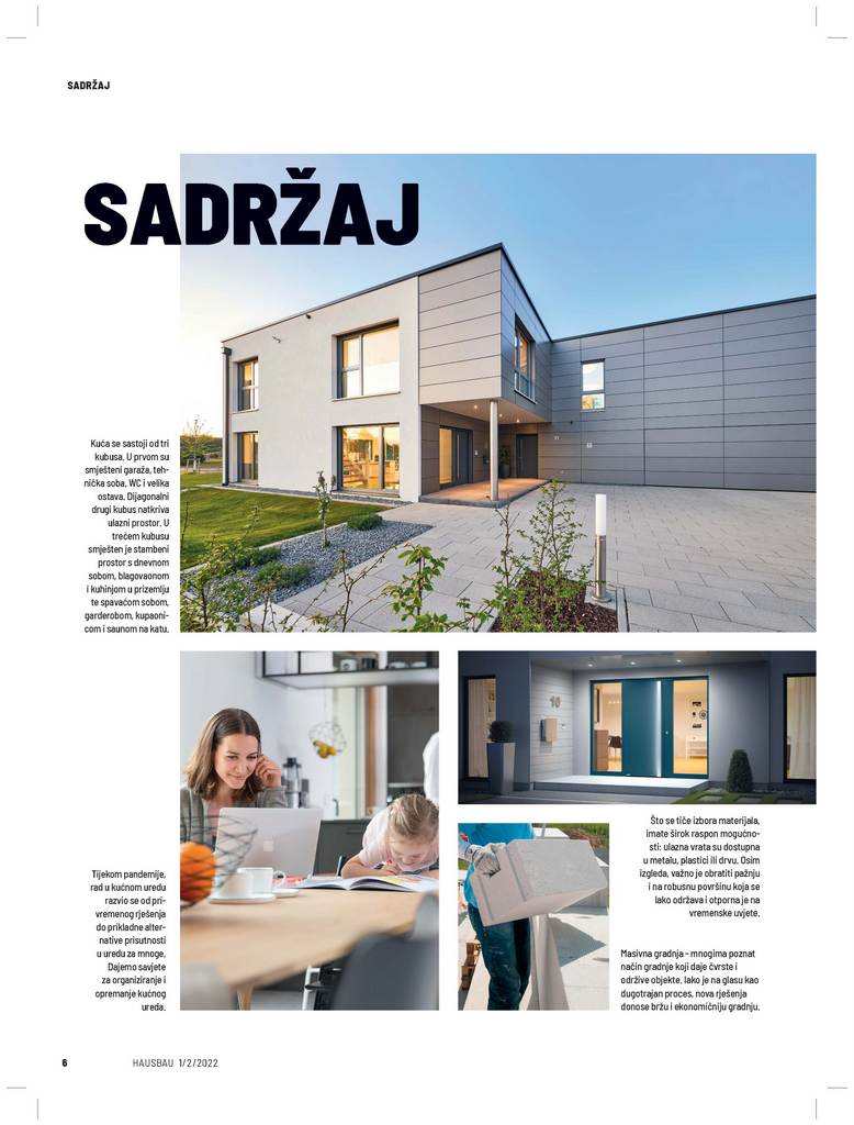 Hausbau prije svega prezentira moderne i energetski učinkovite projekte obiteljskih kuća, domaćih i stranih arhitekata, građenih u različitim sistemima gradnje. Vrhunske fotografije interijera i eksterijera, opis projekta i prezentacija karakteristika te tlocrti idejno su polazište našim čitateljima za realizaciju vlastitih projekata. Kako ne bi sve ostalo samo na idejama, u popularno-stručnim člancima čitatelji mogu pronaći savjete i informacije o različitim proizvodima, sustavima i tehnologijama koji se koriste kod građenja i uređenja. Nisu izostavljeni ni interijeri pa u svakom broju prikazujemo ideje za uređenje, predstavljamo nove proizvode i trendove.