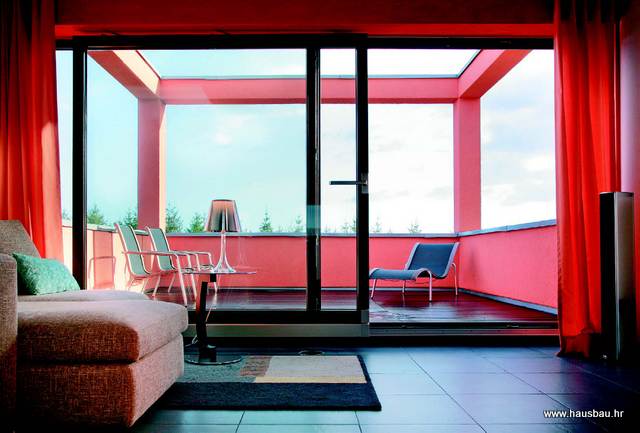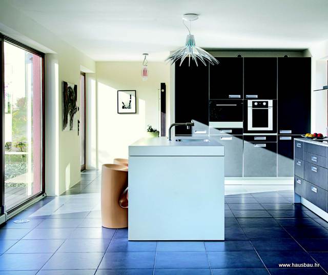 Stanovati na svim razinama – samostalna stambena jedinica u podrumu Na padini na južnoj strani otkriva se samostalna stambena jedinica s terasom u suterenu kuće, koja je koncipirana kao gostinjski trakt. Mala stambena jedinica s pripadajućom kupaonicom ima vlastiti ulaz izvana. Na padini su ukopani podrum i tehnička prostorija s toplinskom pumpom zrak-voda za podno grijanje na svim etažama. S ceste se ulazi na drugu razinu kuće kao u visoko prizemlje: vjetrobran s priključenim WC-om kontinuirano prelazi u otvoreni višenamjenski prostor, gdje su jasno definirani prostori za boravak s blagovaonicom i kuhinja s centralno postavljenim otokom i sudoperom kao samostalna funkcionalna područja.