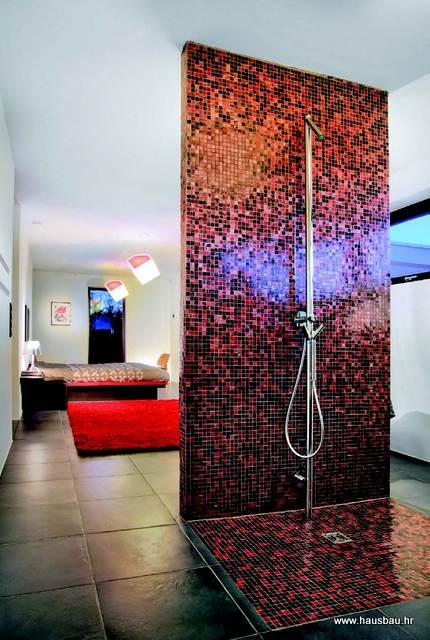 Prozorske površine su tako postavljene da se pojavljuju zone koje su dobro zaštićene od pogleda izvana. Prema naprijed stepenice vode na prvi kat do etaže za spavanje i opuštanje. Sami otvoreni dio za kupanje ima ovdje 16 kvadratnih metara. Iz kreveta, kroz veliku, kliznu staklenu stijenu pruža se slobodan pogled na terasu, te dalje na vrt. Kat iznad, na zadnjoj razini kuće, nalazi se studio koji se može fleksibilno iskoristiti. Služi za TV i kao prostor za opuštanje, ali i kao radna soba i ima dodatnu (krovnu) terasu kao drugi, privatni vanjski prostor.