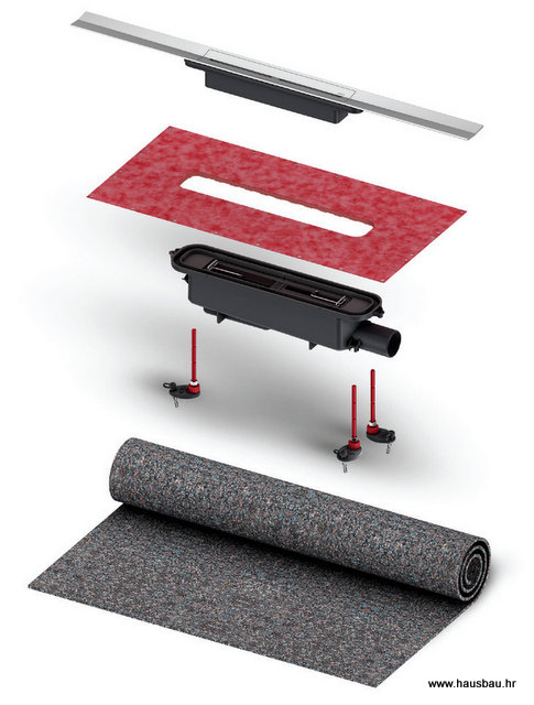 Na taj se način znatno pojednostavljuje izrada ravne površine estriha s padom. Za dodatnu sigurnost kod hidroizolacije zaslužna je fleksibilna brtvena manžeta Seal System koja se uglavljuje direktno u odvod i zatim umeće u površinsku hidroizolaciju. Time se osigurava vodootporan spoj, a do sada uobičajeno lijepljenje hidroizolacije na prirubnicu postaje stvar prošlosti. Naposljetku slijedi umetanje profila, koji se može jednostavno polagati na estrih kao keramička pločica. Jednostavno premještanje po visini omogućuje prilagodbu različitim debljinama keramičkih pločica. Profil može biti od četkanog nehrđajućeg čelika ili nehrđajućeg čelika visokog sjaja i u duljinama od 800, 900, 1000 i 1200 milimetara. Za tijesno prilagođavanje širini tuša u razini poda niši, instalater ili keramičar može jednostavno izvršiti točno podešavanje na licu mjesta. Osim toga, rješenje za montažu dozvoljava naknadno fino podešavanje tuš profila u svim vodoravnim smjerovima i okretanjem.