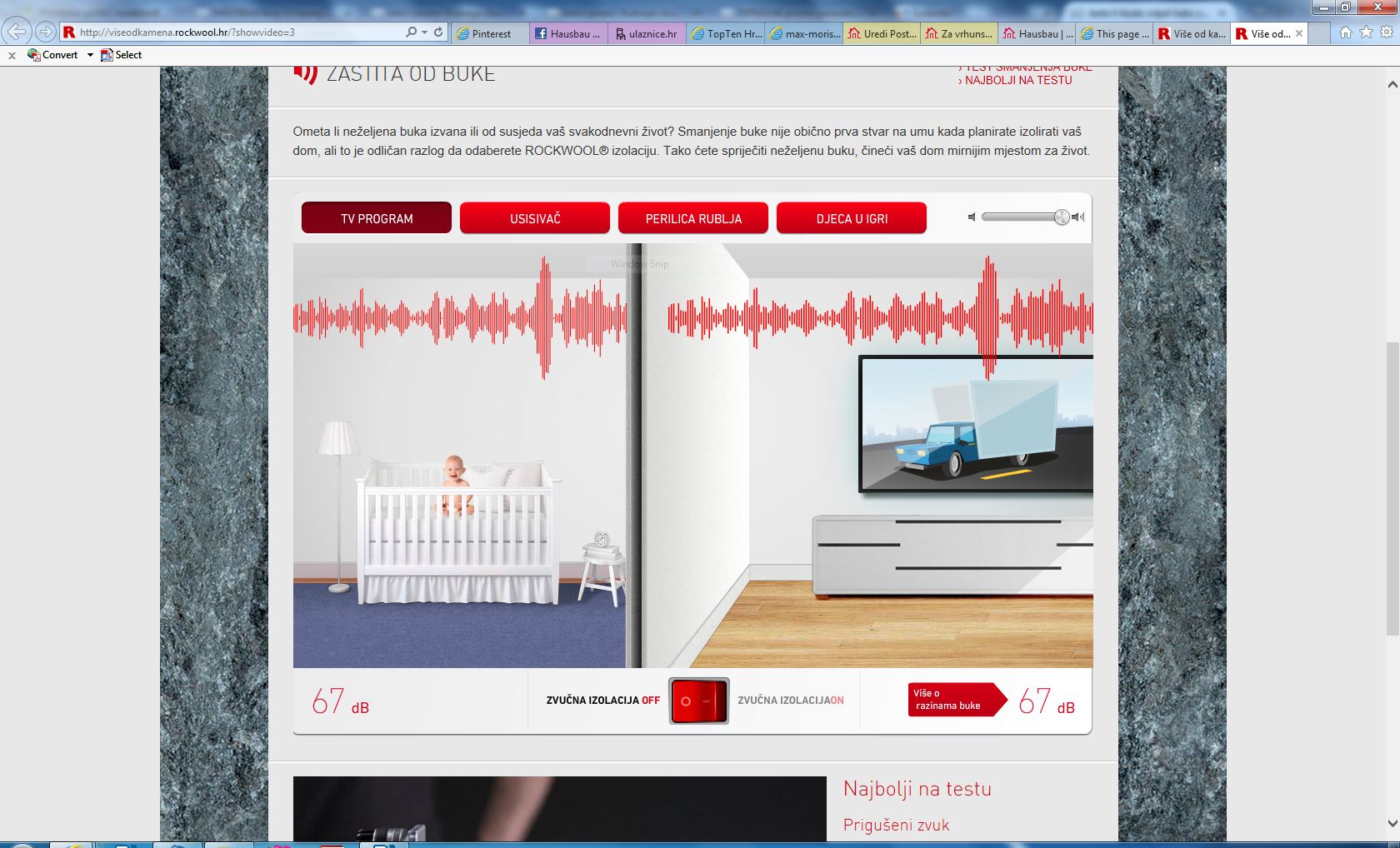 Test smanjenja buke-Isprobajte test smanjenja buke! Ometa li neželjena buka izvana ili od susjeda vaš svakodnevni život? Smanjenje buke nije obično prva stvar na umu kada planirate izolirati vaš dom, ali to je odličan razlog da odaberete ROCKWOOL® izolaciju. Tako ćete spriječiti neželjenu buku, čineći vaš dom mirnijim mjestom za život. Test potražite nahttp://viseodkamena.rockwool.hr/?showvideo=3.